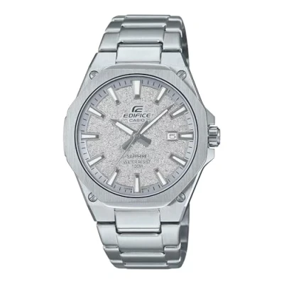 Introducing the EDIFICE EFR-S108 series with a slimmer profile for greater comfort. This Analogue watch features a calendar function: Date and is equipped with Luminous Hands and Luminous Numbers High quality Silver Stainless steel strap, measuring 21 cm in length and 22 mm in width, with a Fold over with push button clasp Case diameter: 39 mm,case thickness: 8 mm, case colour: Silver and dial colour: Grey Water resistant: 10 bars-Weight: 110 g The watch is delivered in an original gift box and has a warranty of 2 years