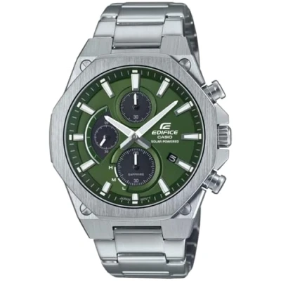 Slim Solar Powered Chronograph with Sapphire Crystal | Although multi-hand chronograph cases tend to be thick, this is a solar powered chronograph with a case kept to a thickness of 9.7 mm to provide an enhanced fit. This Chronograph watch has a calendar function: Date as well as Solar Powered , Stop Watch and Luminous Hands High quality 21 cm length and 21 mm width Silver Stainless steel strap with a Fold over with push button clasp Case diameter: 41 mm,case thickness: 10 mm, case colour: Silver and dial colour: Green Water resistant: 10 bars-Weight: 134 g The watch is delivered in an original gift box and has a warranty of 2 years