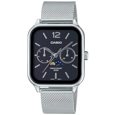 To the moon and back — track the lunar phases with striking analog timepieces featuring multiple inset dials. These timepieces bring together stylish fashion and classic lunar design. This Multi Dial watch has a Calendar function: Day-Date and Moonphase High quality 21 cm length and 20 mm width Silver Stainless steel strap with a Folding Clasp Case measurement: 34 X 37 mm, case thickness: 9 mm, case colour: Silver and dial colour: Black Water resistant: 5 bars -Weight: 84 g The watch is delivered in an original gift box and has a warranty of 2 years