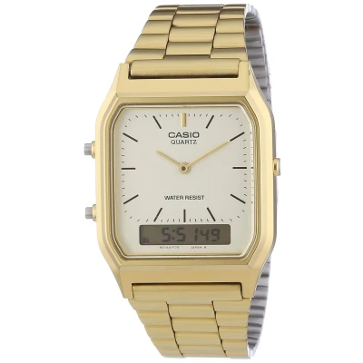 This Casio Casio Collection Analogue-Digital Watch for Men is the perfect timepiece to wear or to gift. It's Gold Rectangular case combined with the comfortable Gold Stainless steel watch band will ensure you enjoy this stunning timepiece without any compromise. Operated by a high quality Quartz movement and water resistant to 3 bars, your watch will keep ticking. This is a perfect elegant and casual watch for you, it's a great gift for family or friends -The watch has a calendar function: Day-Date-Month, Alarm, Stopwatch, Dual Time, 24 hour display High quality 21 cm length and 20 mm width Gold Stainless steel strap with a Buckle Case diameter: 28x39 mm,case thickness: 8 mm, case colour: Gold and dial colour: Gold