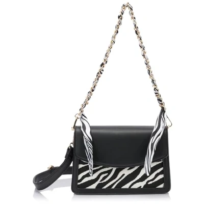 Stylish shoulder bag Made of high quality faux leather Textile front area Flap with magnetic closure Two main compartments