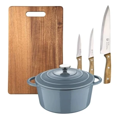 Casserole Dish with Lid Ø25.5 x 12 cm in Cast Iron Colour Blue + 3 Stainless Steel Cuhillos Cutting Board 40 25 NOIA San Ignacio