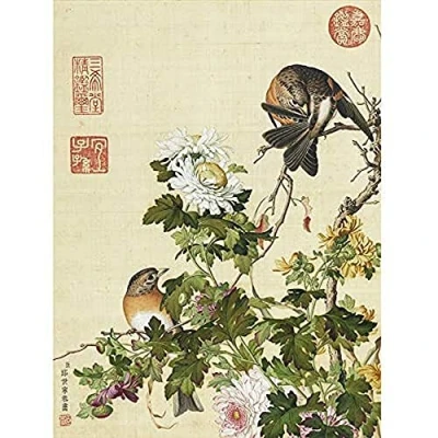 Castiglione Kunstdruck auf Leinwand, Motiv: Chrysanthemen, Vögel