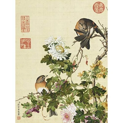 Castiglione Kunstdruck auf Leinwand, Motiv: Chrysanthemen, Vögel, groß, Wandbild