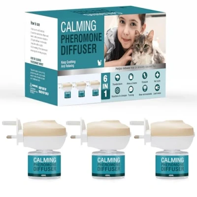 90-DAY LASTING CALM: Cat pheromone diffuser features advanced calming cat pheromones technology to ensure cats stay in a stable state of calm longer. Cat calming diffuser set includes 3 calming cat diffuser heads and 3 48ml cat calming diffuser refill, cat diffuser calming provide cat with ongoing peace of mind for up to 3 months. For best results, place the calming diffusers for cats in an area where cats frequent and avoid obstructions above the cat calming diffuser that may affect diffusion. Comprehensive care: Cat pheromone diffuser covers an area of 700 square feet, cat diffuser provides cat with a wider and more comfortable space for activities. Cat calming diffuser releases calming cat pheromones in a gentle way, making it easier for cats to adapt to various environmental changes. Whether you have a multi-cat household or a single-cat household, a cat calming diffuser set provides thoughtful care, calming cat diffuser makes every cat feels free and comfortable in home A Calm Life for Cats: Cat calming diffuser is dedicated to giving cat a peaceful life. Cat pheromone diffuser is an effective tool for relieving anxiety and stress in cats. Cat pheromone calming diffuser helps reduce cats' restlessness, scratching, and uncontrolled behavior, cat calming diffuser provides a peaceful environment, and relieves tension between multiple cats. Cat calming diffuser calms cat's restless moods, cat pheromone diffuser make cats enjoy a calmer and more enjoyable life. Fast effective and widely applicable: Cat calming diffuser is non-irritating, harmless and cat diffuser calming release powerful cat pheromones that work quickly. Cat pheromone diffuser is suitable for cats of all ages. Cat calming plug in has a rotated design to fit a variety of power sockets, cat calming plug in makes it convenient to use. Cat calming diffuser refill is very easy to storage. Cat calming pheromone diffuser provides a simple yet effective solution to cat's stress and anxiety Careful Use & Product Service: When using cat pheromones calming diffuser, please insert the cat diffuser correctly and keep the vents of the cat calming diffuser facing up. It is normal for cat calming plug in to get hot when working, so there is no need to worry too much about cat pheromone diffuser. We are well aware of the details of using cat calming diffuser and the importance of cat health. If you have any questions or needs about cat calming diffuser, please feel free to contact us