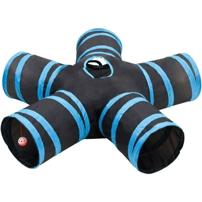 ManoManoGeneral description This 5-way cat tunnel provides a fun and mysterious environment for your pets to play and exercise. Made from durable polyester, it is suitable for both indoor and outdoor use. Technical specifications Material: Polyester, steel Tunnel length (each): 30 cm Tunnel diameter: 25 cm Peephole diameter: 14 cm Color: Black, blue Usage Interactive play: The tunnel features built-in crackling paper for added sound stimulation. Curiosity piquing: A hanging ball at one entrance encourages your pet to explore. Multi-pet friendly: Suitable for cats and other small pets like puppies, rabbits, hamsters, and ferrets. Other information Delivery contains: 1 x Cat tunnel, 1 x Carry bag Intended for pet use only. Keep out of reach of children!