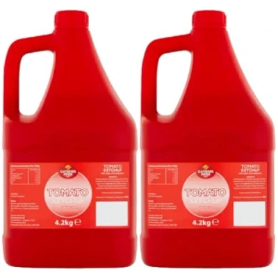 Bulk-sized bottle of Caterers Pride Tomato Ketchup (4.3kg). Made from ripe tomatoes for a rich and tangy flavor. Versatile condiment for various dishes. Ideal for catering, restaurants, and large-scale cooking. Convenient packaging for easy dispensing.