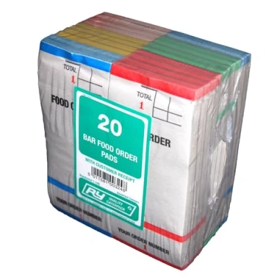 20 Caterpack coloured food order pads containing 100 pages numbered 1 -100 Ideal for use in a bar, restaurant or cafe environment where food orders are taken. Each sheet can be teared from the pad. With customer receipt numbered 1-100