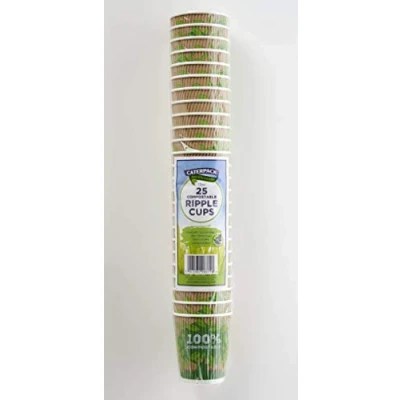 Lined with plant based PLA 100% biodegradable and compostable No need for additional sleeves with its double walled ripple cup design Bold print, ripple wall design Suitable for hot and cold beverage. Also available in 12oz
