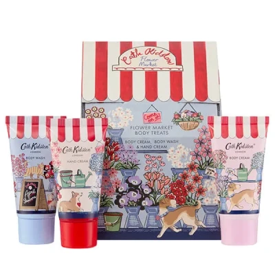 Step into the Cath Kidston Flower Market Body Treats collection—a charming trio of 30ml vegan body care essentials, presented in a decorative Flower Stall carton featuring Cath Kidston’s hand‑painted artwork, complete with a classic striped awning and playful dogs.Inside, you’ll find a nourishing hand cream enriched with shea butter, cocoa seed butter and vitamin E; a gently cleansing body wash with a glycerin base and essential oils of sweet orange and bergamot; and a velvety body cream formulated with shea butter, glycerin and softening essential oils.All three products share the uplifting Fruit Basket fragrance—a bright blend of mango, peach, rhubarb, blackcurrant and pineapple that captures the energy of a well‑stocked market stall.Packaged in recycled plastic tubes and a fully recyclable carton from responsibly managed forests, this vegan‑friendly, cruelty‑free set makes a thoughtful gift or an easy way to bring a touch of Flower Market charm to your daily routine.