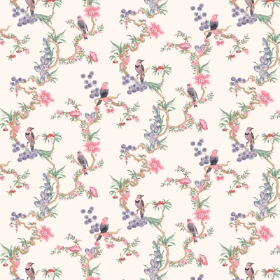 A modern look at the classic Chinoiseries pattern, with trailing branches festooned in flowers and feathers with exotic birds. Shown here in the fresh multi-coloured Spring colourway.
