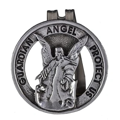 Reads "Guardian angel protect us" Attach to your car or truck visor to hold papers and bring protection in your travels Comes carded on a 3 by 4 inch card High quality pewter material; includes clip on back