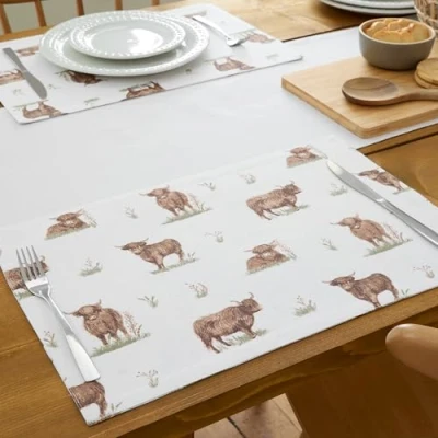 Catherine Lansfield Angus Highland Cow Cotton 30x46cm Dining Placemat 4 Pack Natural