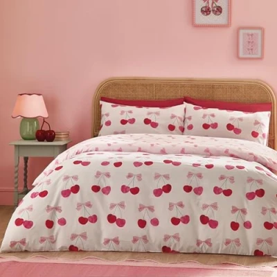 Catherine Lansfield Cherries and Bows Reversible King Duvet Cover Set with Pillowcases Pink