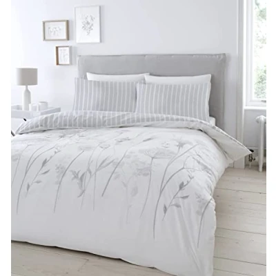 Catherine Lansfield Meadowsweet Floral 135 x 200 cm Duvet Cover and 1 80 Pillowcase White/Grey BD/51080/W/DE135200/WGY