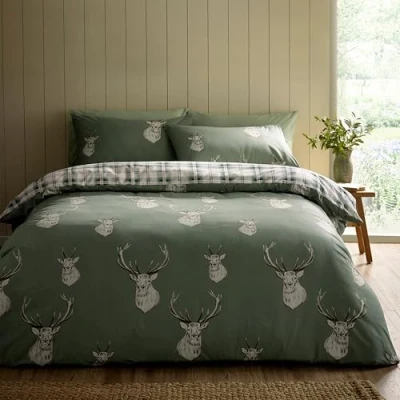 Catherine Lansfield Stag Check Reversible Single Duvet Cover Set with Pillowcase Soft Green