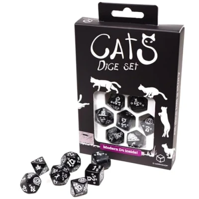 This dice set consists of 7 polyhedral dice: D6, D8, D10, D12, D20, D100, and a Modern D4. This dice set is kept in a shimmering black & silver color theme. The digits on these dice have cat ears and are accompanied by yarn balls, mild bowls, and cat's paws trails! Each dice presents a different type of cat silhouette on its highest face! The CATS Dice Set: Waffle is produced in Poland, EU., Manufacturer: Q WORKSHOP