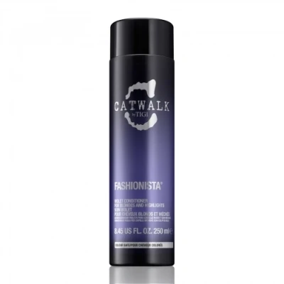 Purple conditioner enhances blonde shades and cool tones Reduces brassy and yellow tones in blonde hair Moisturises, conditions and smooths frizz Delivers captivating shine The Catwalk by Tigi Fashionista Blonde Conditioner 250 ml is ideal for blonde hair, grey hair and white hair
