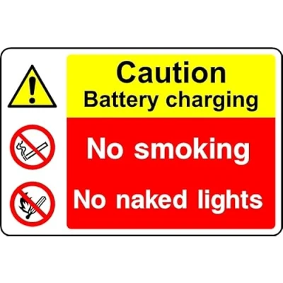 Caution Battery Charging no Smoking Naked Lights Safety Sign Self Adhesive Sticker (300mm x 200mm)