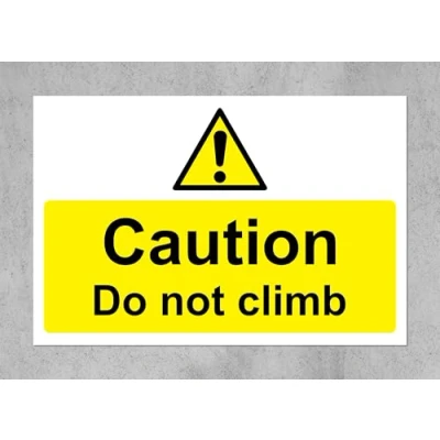 Caution do not climb safety sign 1mm Plastic sign Digitally printed and laminated for extra durability Drill and screw in position or use double sided tape to mount onto suitable surface