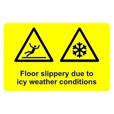 Caution floor slippery due to icy weather safety sign. 3mm Aluminium sign. Digitally printed and laminated for extra durability. 10mm Radius rounded corners, no sharp edges. All signs come with a 5-year warranty. All our signs are UV resistant meaning they will not fade in sunlight. Suitable for indoor & outdoor use.