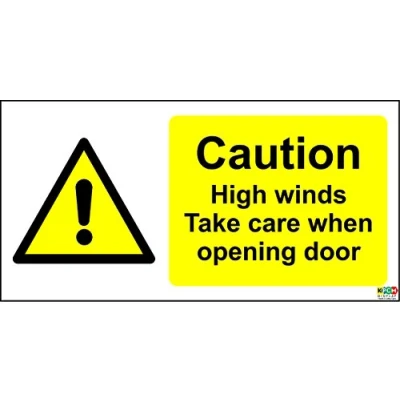 CAUTION HIGH WINDS TAKE CARE WHEN OPENING DOOR SIGN Self adhesive sticker 200mm x 100mm Remove backing film and apply to dry, smooth, oil free surface. Digitally printed and laminated for extra durabillity