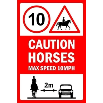 Caution horses, max speed 10mph, leave 2m space 1mm flexible Plastic sign (600mm x 400mm)