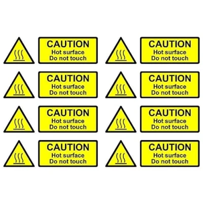 Caution hot surface do not touch Safety sign - Pack of 8 150mm x 50mm Self adhesive stickers. Self adhesive stickers on sheet. Remove backing film and apply to dry, smooth, oil free surface. Comes on easy to peel sheets for handy application.