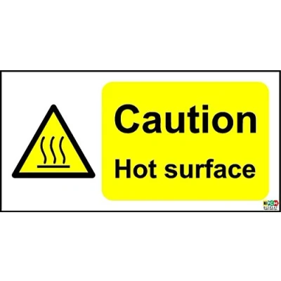 Caution Hot Surface Safety Sign Self adhesive sticker 200mm x 100mm Remove backing film and apply to dry, smooth, oil free surface. Digitally printed and laminated for extra durabillity