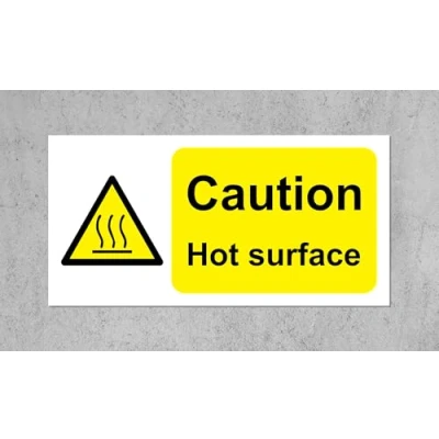 Caution Hot Surface Safety Sign Self adhesive sticker 200mm x 100mm Remove backing film and apply to dry, smooth, oil free surface. Digitally printed and laminated for extra durabillity