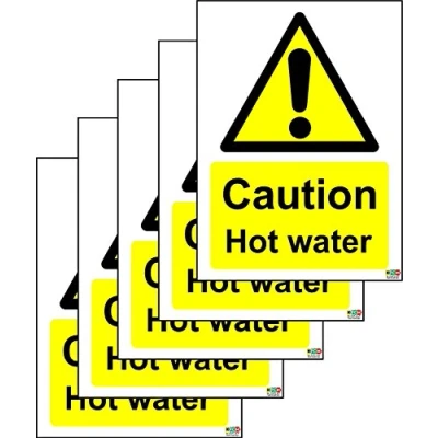 Caution Hot Water Safety Sign Self adhesive sticker 100mm x 75mm (PACK OF 5 STICKERS) Remove backing film and apply to dry, smooth, oil free surface. Digitally printed and laminated for extra durabillity