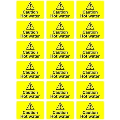 Caution hot water safety sign Pack of 18 Self adhesive stickers 66mm x 44mm Remove backing film and apply to dry smooth oil free surface
