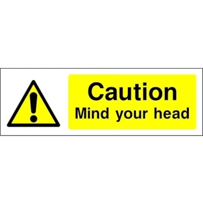 Caution mind your head Safety sign 1.2mm Rigid plastic 450mm x 150mm Digitally printed and laminated for extra durability Drill and screw in position or use double sided tape to mount onto suitable surface.
