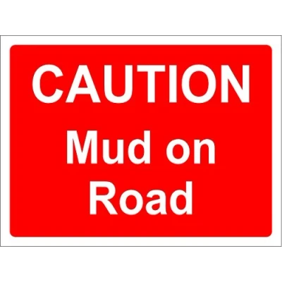 Caution mud on road safety sign 1.2mm rigid plastic 300mm x 200mm Digitally printed and laminated for extra durability Drill and screw in position or use double sided tape to mount onto suitable surface.