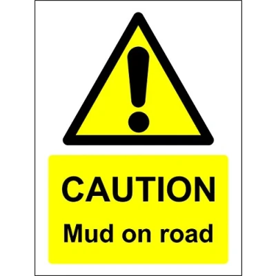 CAUTION Mud on road sign 1.2mm rigid plastic 400mm x 300mm Digitally printed and laminated for extra durability Drill and screw in position or use double sided tape to mount onto suitable surface.
