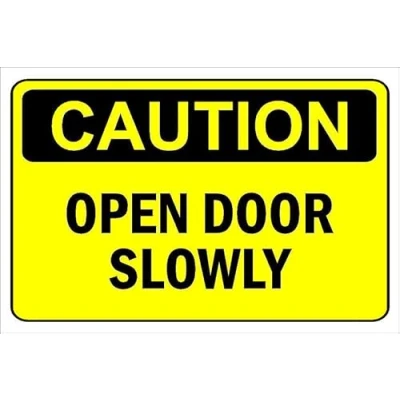 Caution, open door slowly, warning sign. Self adhesive sticker. Printed using the latest digital technology and laminated for extra durability. Remove backing film and apply to dry, smooth, oil free surface. All signs come with a 5-year warranty.