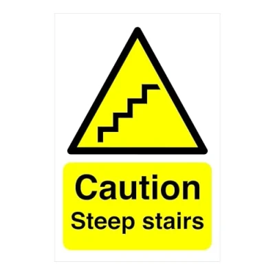 Caution Steep stairs Safety sign Material Type: Hight tack self adhesive vinyl and laminated for extra UV durability (environmentally friendly) Sign measures: 300mm x 200mm This sign conforms to EN ISO 7010:2012 standards, featuring a centrally positioned black pictogram or text against a contrasting background