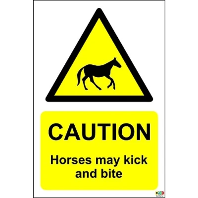 CAUTION These horses may kick and bite sign Self adhesive sticker 200mm x 150mm Remove backing film and apply to dry, smooth, oil free surface. Digitally printed and laminated for extra durabillity