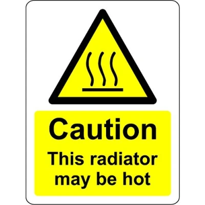Caution this radiator may be hot Safety sign Self adhesive sticker 150mm x 100mm Digitally printed and laminated for extra durability Remove backing film and apply to dry, smooth, oil free surface.