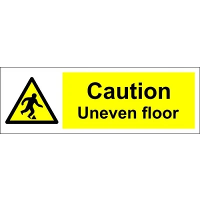 caution uneven floor sign 300mm x 100mm 1.2mm rigid plastic Drill and screw in position or use double sided tape to mount onto suitable surface. Digitally printed and laminated for extra durability