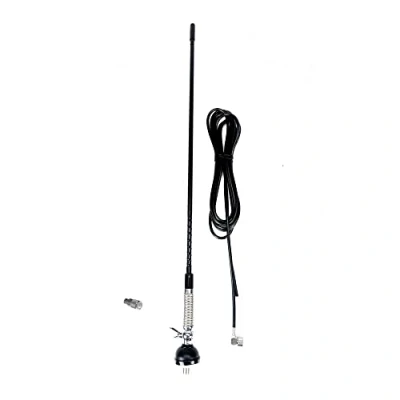 The performance of the product is closely related to the technical characteristics of the antenna in ideal conditions of installation and use: maximum applied power 200 W, impedance 50 Ohms, stainless steel. Communication distance is another decisive factor in the acquisition and use of a CB antenna. Thus, the communication distance of 10 km is reached in ideal working conditions: calibrated antenna, open field without obstacles, the station with the maximum legally allowed power of 4W and with a standard reception. Any obstacle such as: hills, mountains, buildings, walls can reduce this distance. Antenna length is another very important factor that can influence the communication distance in traffic. Thus, the longer the antenna, the longer the range. The antenna in this kit has a length of 59 cm. The length of the cable is 4 m, thus allowing you to mount the antenna wherever it is convenient on your vehicle and still get to make the connection with Radio CB. This antenna can be tilted with the butterfly screw with which it is provided, to enter passages, garages or parking lots with low height. Apart from these situations, an inclination of more than 30 degrees is not recommended because it can affect the performance of the antenna.