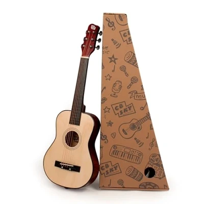 Help your little one start or take the next step in learning and playing guitar with this acoustic wood guitar. Encourage your child to develop their interest in music, allow them to be musically creative and have lots of fun at the same time. Comfortable, medium-size neck and body with great tone and playability. Recommend for children age 3 - 8. Accurate fret spacing with low string height means easier playing. Child-safe paint finish and sturdy wood construction make this a long-lasting toy your child will love for years to come Fitted with steel strings. NOTE: Due to the elasticity nature of new strings, the instrument needs to be tuned repeatedly until the strings become stable.