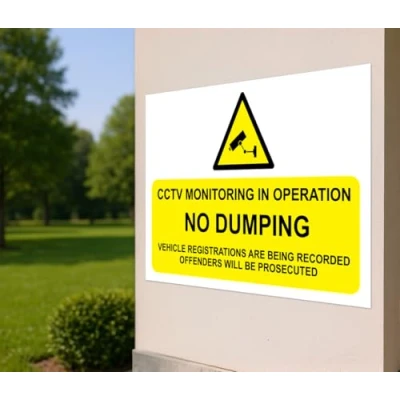 CCTV in operation no dumping safety sign. 3mm Aluminium sign. Digitally printed and laminated for extra durability. 10mm Radius rounded corners, no sharp edges. All signs come with a 5-year warranty. All our signs are UV resistant meaning they will not fade in sunlight. Suitable for indoor & outdoor use.