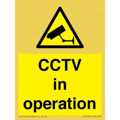 W913 : CCTV This sign is made from vinyl gold sticker Gold metal effect sticker for flat, clean surfaces. Not for rough, plastic, or dusty surfaces. A7 portrait Sign Text: CCTV in operation