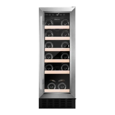 JoybuyThe CDA CFWC304SS is a 30cm slimline freestanding wine cooler with a stainless steel finish, holding up to 20 bottles on wooden shelves. It features triple-glazed UV-protected glass, touch control with a 5°C-18°C temperature range, LED lighting, and a reversible door—ideal for compact, modern kitchens.