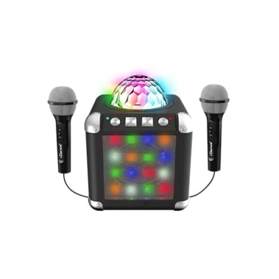This karaoke with spectacular lights includes a disco ball cube that projects 20 different types of lights on walls and ceiling to create a perfect party atmosphere. VOICE VERSATILITY - Have fun with 5 different voice changers and an adjustable echo effect to give your voice a unique touch Dynamic Duo: Two microphones included so you can sing in duet with friends and family, great for parties and gatherings. MAXIMUM MOBILITY: Portable and lightweight design with rechargeable battery offers up to 4 hours of non-stop music fun. Full connectivity: Bluetooth compatible, allows you to connect devices such as iPhone, iPad and Android, plus streaming from YouTube and Spotify