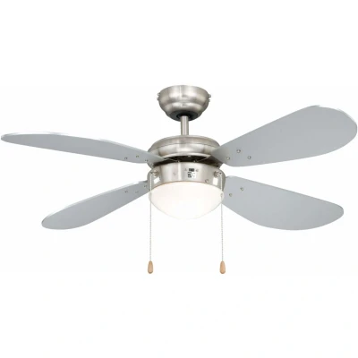 ManoManoGeneral description The Ceiling Fan Classic Nickel / Silver with Light combines functionality and style, featuring a brushed nickel housing and silver blades. It is designed to enhance your living space while providing efficient airflow and lighting. Technical specifications Voltage: 230 V ~ 50 Hz Diameter: 105 cm / 42" Housing colour: brushed nickel Blade colour: silver Blade pitch: 11° Lighting: uses 1 x E14 base, max. 60 W (bulb not included) Motor wattage: 25 / 35 / 50 W Revolutions per minute: 100 / 160 / 235 Max. airflow: 117 m³/min / 4131 CFM Ceiling to blades: 23.5 cm / 8.8" Overall drop: 33.6 cm / 13.2" Diameter canopy: 13 cm / 5.1" Max. ceiling slope: 23° Weight: 5.1 kg / 11.2 lbs Usage Manual reversing switch for summer and winter mode on the housing Pull cord operation: 3 fan speeds / off, light on / off