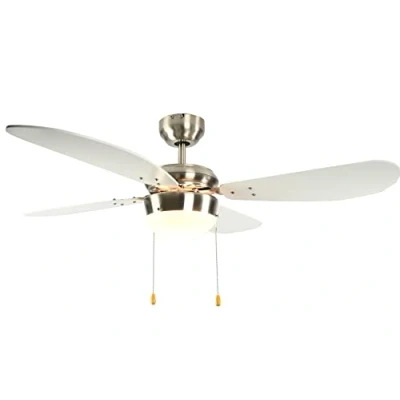 General description The Classic Nickel / White Ceiling Fan combines style and functionality, featuring a brushed nickel housing and white blades. It is designed to enhance your living space while providing efficient airflow and lighting. Technical specifications Voltage: 230 V ~ 50 Hz Diameter: 105 cm / 42" Housing colour: brushed nickel Blade colour: white Blade pitch: 11° Lighting: 1 x E14 base, max. 60 W (bulb not included) Motor wattage: 25 / 35 / 50 W Revolutions per minute: 100 / 160 / 235 Max. airflow: 117 m3/min / 4131 CFM Ceiling to blades: 23.5 cm / 8.8" Overall drop: 33.6 cm / 13.2" Diameter canopy: 13 cm / 5.1" Max. ceiling slope: 23° Weight: 5.1 kg / 11.2 lbs Usage Manual reversing switch for summer and winter mode on the housing Pull cord operation: 3 fan speeds / off, light on / off