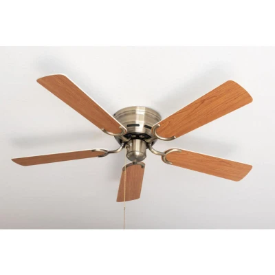 General description The Kisa Deluxe AB Ceiling Fan combines functionality and style with its antique brass housing and reversible white/maple blades. Designed for optimal airflow and comfort, this fan is perfect for enhancing any room's ambiance. Technical specifications Voltage: 220-240 Volt Frequency: 50 Hertz Diameter: 105 cm / 42" Blade pitch: 12° Max. motor wattage: 44 W Max. revolutions per minute: 202 Max. airflow: 5220 m³/h / 3072 cfm Max. noise level: 52 dB(A) Ceiling to blades: 15.0 cm / 5.9" Overall drop: 19.0 cm / 7.5" Diameter of motor housing: 21.5 cm / 8.5" Weight: 5.7 kg / 12.6 lbs Compatibility and accessories Not compatible with remote control Optional wall control sold separately Optional accessories available in our shop Installation Not suitable for sloping ceilings Usage Includes pull cord for 3 fan speeds / off Manual reversing switch for summer and winter mode on the housing
