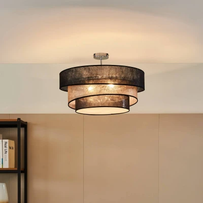 Lights.coBlack and gold ceiling lamp Ayvira with a multi-layer lampshadeThe ceiling lamp Ayvira looks very modern and elegant on the ceiling. It is characterized by its fancy lampshade, which consists of a total of three layers. The elements of the shade are designed asymmetrically, alternating black and gold color. This gives the lamp a stylish color combination that makes it a real eye-catcher on the ceiling in a modern environment, even when the light is off. It looks very nice in the living room as well as in the bedroom.